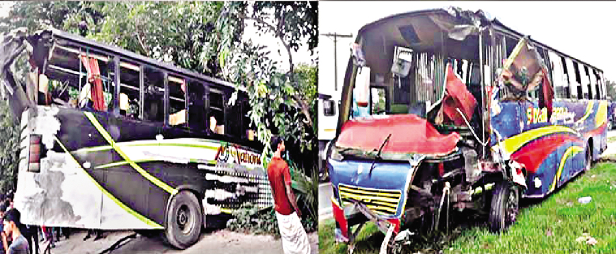 Two buses were left badly damaged as the vehicles collided head-on in Bonpara-Hatikumrul area of Natore's Baraigram upazila on Saturday Story on Page 1
