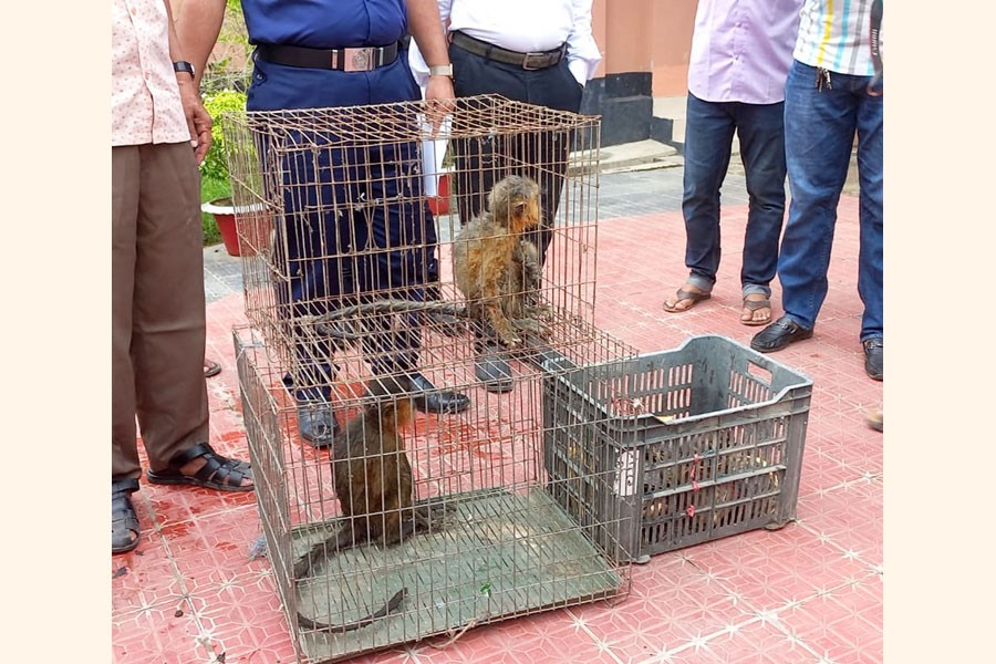 Two illegally captured langurs of rare species and 16 tortoises kept in separate cages after their seizure from a man by the police in Feni on Sunday. Later, the tortoises were released in a pond of the forest department in Kazirbag Eco Park in the district while the langurs were handed over to a forest range official in Fen. — Focus Bangla
