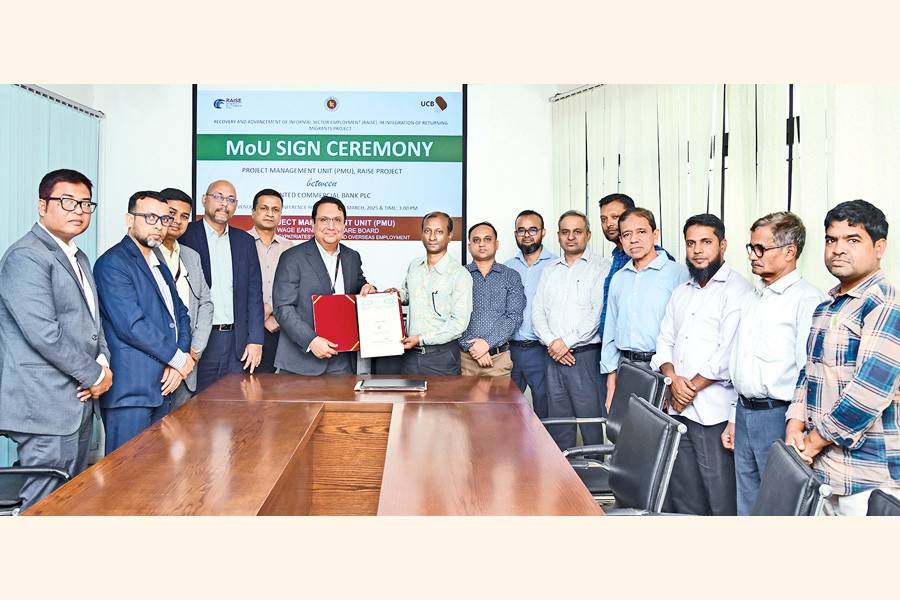 United Commercial Bank (UCB) PLC and the RAISE Project, which is under the Wage Earners Welfare Board (WEWB), have recently signed a Memorandum of Understanding (MoU) to help returnee migrant workers access finance for entrepreneurship. UCB's Additional Managing Director Adnan Masud and RAISE Project Director Dr ATM Mahbub-Ul Karim signed the MoU at Probashi Kallyan Bhaban in the city. As part of this partnership, UCB will offer tailored financial services to support their transition to self-employment.