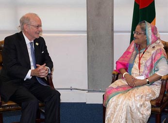 Unicef Executive Director Anthony Lake has praised Prime Minister Sheikh Hasina for Bangladesh’s initiatives to protect rights of the girl children. Lake has hailed the prime minister during a meeting with her on the sideline of the Girl Summit at London. Hasina attended the summit at the invitation of British Prime Minister David Cameron, who is the main initiator of the summit. Prime minister’s Press Secretary AKM Shamim Chowdhury told journalists that Lake called Hasina ‘the symbol of liberal and progressive world leaders’ at the meeting. He said: ‘The Unicef executive director praised the prime minister for giving various financial supports including free education up to secondary level and stipends for protection of rights of the children, specially the girl children.’ Chowdhury said the Unicef official also hailed development of Bangladesh in different fields and its progress towards attainment of the Millennium Development Goals (MDG). He quoted Lake as telling the prime minister: ‘When I look at the MDG chart, I see Bangladesh green in all aspects,’ according to bdnews24.com.