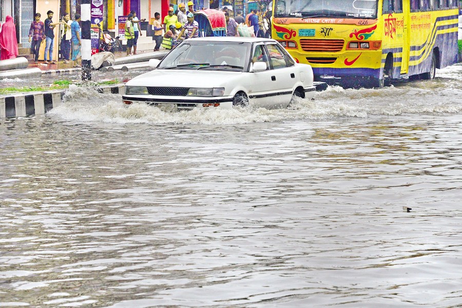 Vehicles move through an inundated portion of Kalshi road in the capital's Mirpur area on Tuesday. Many roads in the city went under water due to heavy downpours since the morning — FE photo