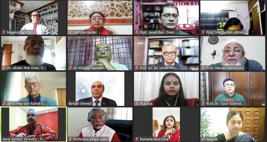 Vice-chancellor of Jagannath University Prof Dr Mizanur Rahman, freedom fighter Lion Benajir Ahmed and former chairman and member of Board of Trustees of North South University Dr Nuzhat Chowdhury, among others, speaking at a virtual discussion on 'Martyred Intellectuals Day' organised by NSU on its campus in the city on Monday. Vice chancellor of the university Prof Atiqul Islam presided over the discussion.