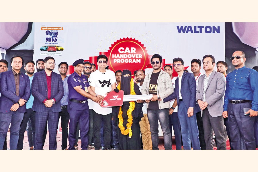Walton Plaza's Chief Executive Officer Md Rayhan, Deputy Managing Director Md Humayun Kabir, Senior Executive Director renowned film actor Amin Khan and popular film actor and model Mamnun Hasan Emon officially handed over the car key to Khadiza Bibi at a ceremony held at Raninagar Abadpukur High School playgrounds on Monday. Khadiza Bibi, a housewife at Raninagar in Naogaon, received a Japanese car for free on the purchase of a Walton refrigerator during the nationwide ongoing Walton's 'Digital Campaign Season-18.'