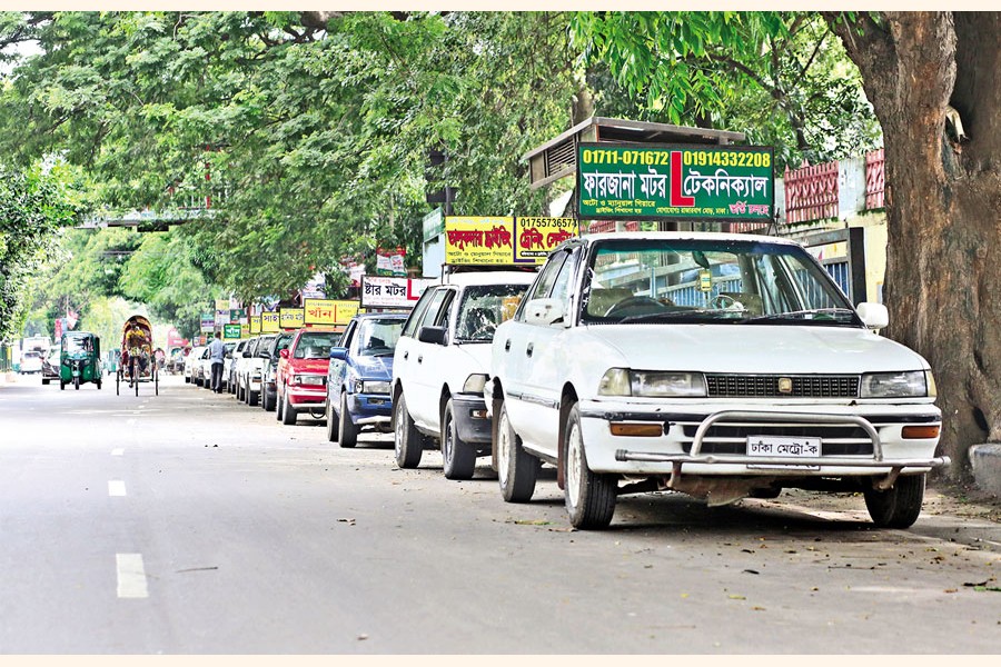 Cars parked on the road in front of Motijheel Government Boys' High School in the city on Wednesday wait for people willing to learn driving. More and more people, including male and female, are visiting these schools to learn how to drive, while the trainers make a living by imparting knowledge and skills on how to master the trade — FE photo by KAZ Sumon