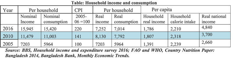 Household income and consumption as estimated by HIES2016 are given below in Table 1. The nominal income and consumption both increased by about two-fifths since the last HIES was done in 2010. These were highlighted when the survey results were released. However, there is no definable relationship between household nominal income and its purchasing power. The latter is captured by real income.