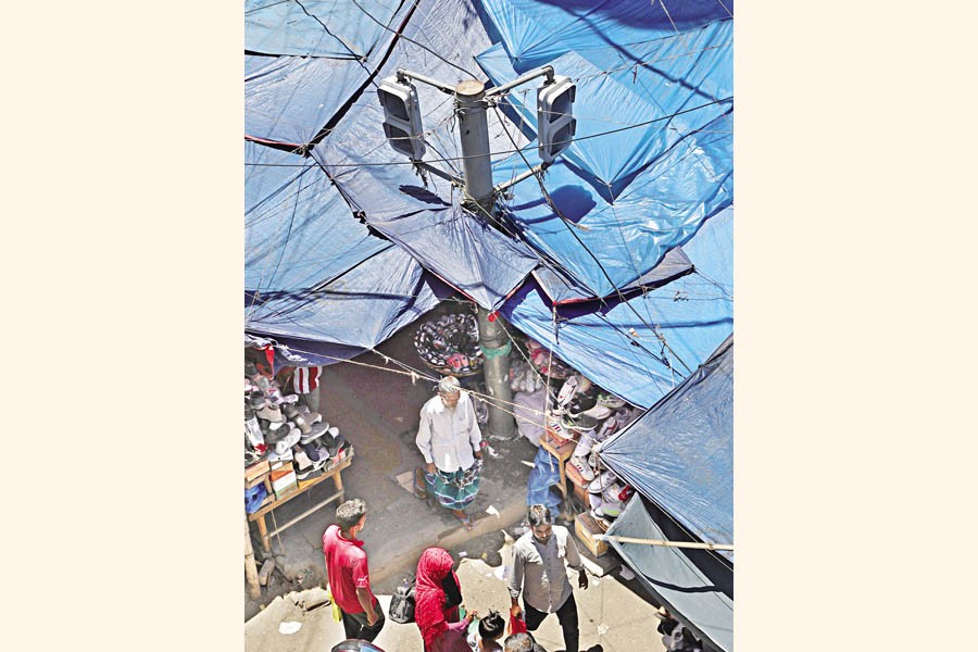 With makeshift covers giving protection from the sun and rain, vendors run their business on the footpath adjacent to Dhaka Trade Centre in Gulistan area of the city, making it difficult for pedestrians to walk freely. The photo was taken on Friday. — FE photo by Shafiqul Alam