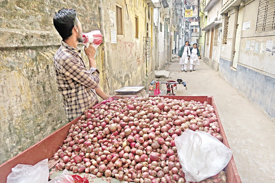 With newly harvested onions hitting the market, prices have fallen, and vendors across neighbourhoods in the capital are offering them at discounted rates. In this photo, a vendor uses a loudspeaker to sell 2.5 kilogrammes of onions for just Tk 100 in the Gendaria area on Wednesday. — FE Photo