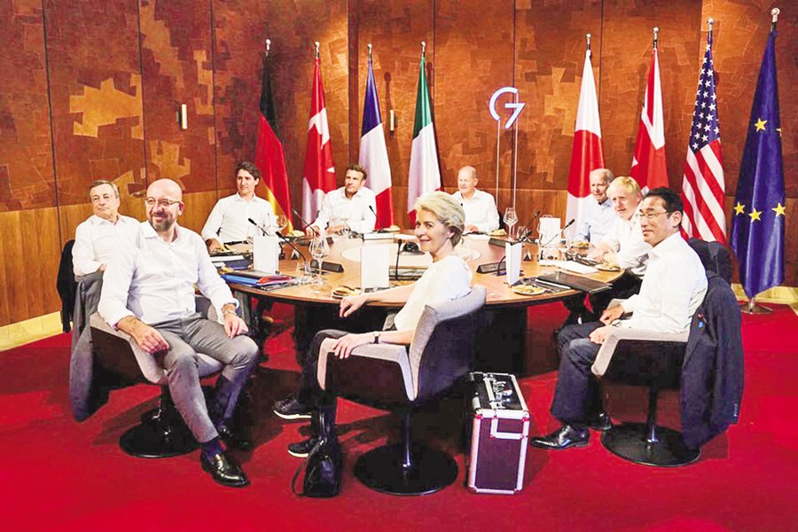European Council President Charles Michel, European Commission President Ursula von der Leyen, Japanese Prime Minister Fumio Kishida, British Prime Minister Boris Johnson, US President Joe Biden, German Chancellor Olaf Scholz, French President Emmanuel Macron, Canadian Prime Minister Justin Trudeau and Italian Prime Minister Mario Draghi attend a working dinner during the first day of the G7 leaders' summit at Bavaria's Schloss Elmau castle, near Garmisch-Partenkirchen, Germany — Reuters