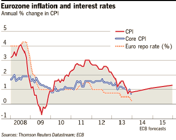 Inflation in the 18 countries that use the euro sank to 0.3 per cent in August. A worrying sign of economic weakness that is putting pressure on the European Central Bank to take drastic steps to save a stalling recovery. The figure was down from 0.4 per cent in July, statistics agency Eurostat said Friday, and is the lowest since October 2009. Back then the eurozone was deep in recession following the collapse of US investment bank Lehman Brothers. The low inflation figure comes amid increasing worry about the health of the modest recovery in Europe's currency union, a major pillar of the global economy with some 17 per cent of world annual output. The eurozone showed no growth at all in the second quarter as fears about the Ukrainian crisis weighed on consumers and investment decisions. Unemployment remained high at 11.5 per cent in July, unchanged from the month before. Core inflation, which excludes volatile food and energy, sent a modestly brighter signal as it rose to 0.9 per cent from 0.8 per cent, according to AP.