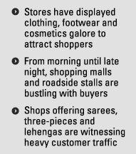 Shops offering sarees, three-piece suits, gowns, lehengas and other fashionable outfits are witnessing heavy customer traffic. Cosmetic stores and footwear outlets are also seeing a steady stream of buyers.