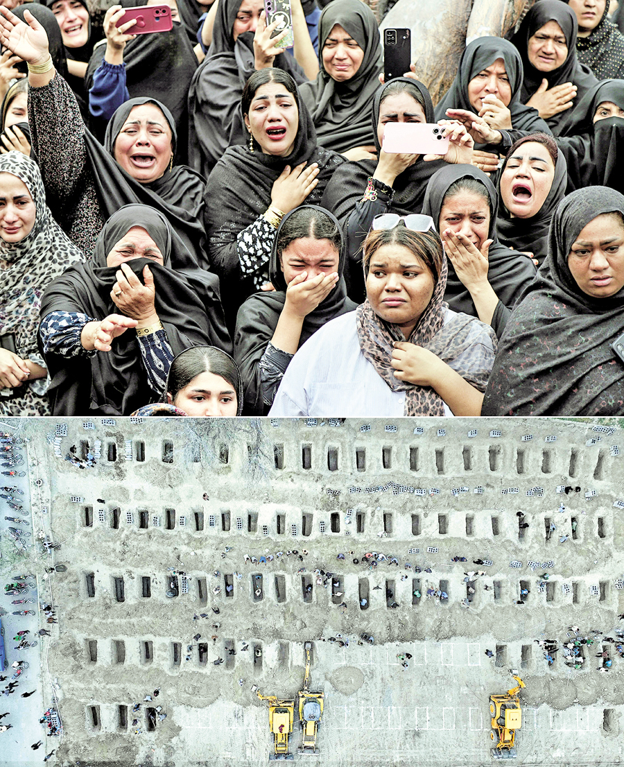 (Top) Mourners cry during the funeral of children killed in a strike on a primary school in Minab of Hormozgan province, Iran, on Tuesday, as graves (bottom) are being prepared for them. — AFP