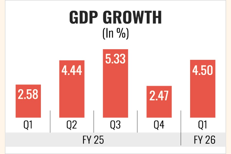 The economy got a boost with the gross domestic product (GDP) having grown at a rate of 4.50 per cent in the first quarter (July-September) of the current fiscal (FY) 2025-26, according to Bangladesh Bureau of Statistics (BBS) data released Tuesday.