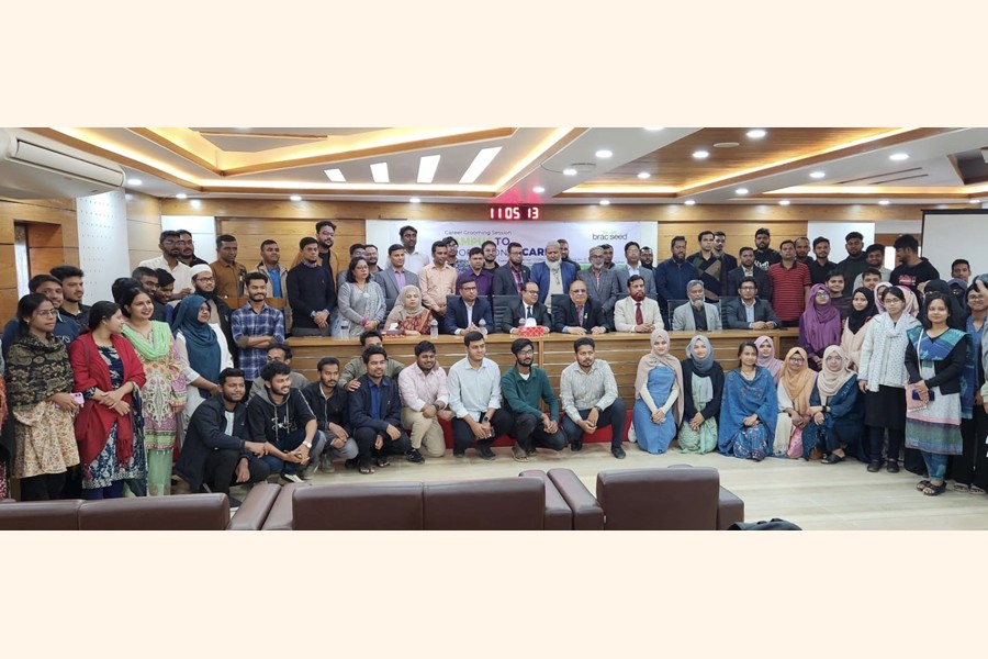Vice-Chancellor of Sylhet Agricultural University (SAU) Prof. Dr. Md. Alimul Islam and Dean of the Faculty of Agriculture Prof. Shahidul Islam pose with the participants of the career grooming programme titled "Campus to Professional Career," held at the Athena Livestock Department Conference Hall of SAU in Sylhet on Tuesday