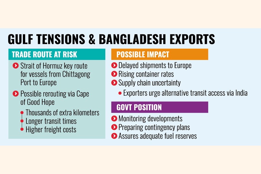 Bangladesh's exporters are bracing for longer shipment lead times and higher freight costs amid fears that an escalation of the Middle East conflict could disrupt key global trade routes, particularly the Strait of Hormuz.