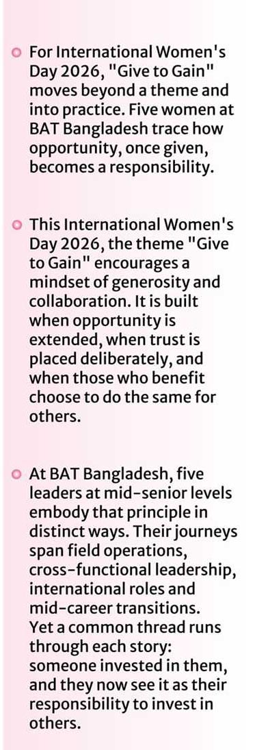 For Sunayna Illin, the most pivotal support in her career came early, when she joined BAT Bangladesh and was entrusted with significant responsibility from the outset.