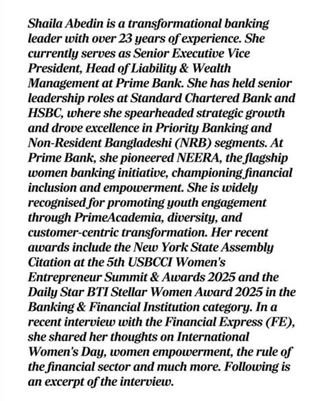 SA: Neera was born from the realisation that women need an ecosystem, not just isolated products. While women comprise nearly half of Bangladesh's population, their labour force participation is only 37 per cent due to structural gaps in finance and asset ownership. Closing this gap unlocks national economic potential. Global research shows that advancing women's economic participation accelerates GDP growth. Women reinvest up to 90 per cent of their income into their families, creating a multiplier effect for social resilience. Empowering women, therefore, is not only a social responsibility, it is a strategic growth imperative. At Prime Bank, we recognise that women's aspirations evolve across life stages - from students and professionals to entrepreneurs, homemakers, and seniors planning their legacy. Each stage carries distinct financial and emotional needs. Neera was designed around this complete life cycle, serving women across all socio-economic segments with relevance and empathy. Importantly, Neera goes beyond traditional banking to embrace complete wellness, integrating financial solutions with mental health, physical well-being, leadership development, and networking. True empowerment is multidimensional. When women progress, families thrive, and economies strengthen. Neera is Prime Bank's strategic commitment to enabling that transformation.