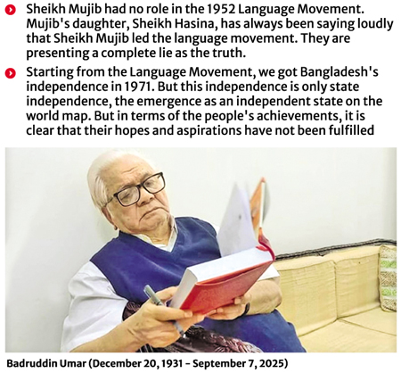 Badruddin Umar: Sheikh Mujib had no role in the 1952 Language Movement. Mujib's daughter, Sheikh Hasina, has always been saying loudly that Sheikh Mujib led the language movement. A writer and novelist wrote in a newspaper under the headline 'Bangabandhu and the Language Movement'. How did he come to that movement? These are the people who are talking about it. They are presenting a complete lie as the truth.