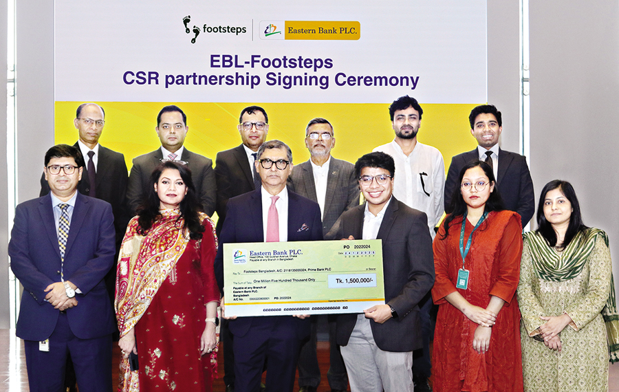 Eastern Bank (EBL) has partnered with Footsteps Bangladesh under its flagship CSR initiative “Project Britto” to establish specialized libraries for children with special needs, promoting inclusive education and independent learning. Ziaul Karim, head of communications and external affairs at EBL, handed over a cheque to Mohammad Taqi Yasir, barrister of Lincoln’s Inn and co-founder and vice president of Footsteps Bangladesh, at the bank’s head office in Dhaka recently.