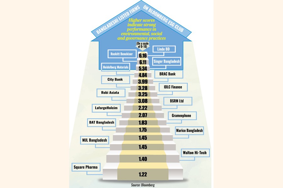 Earlier in 2023, only seven local listed firms - Grameenphone, BAT Bangladesh, Marico Bangladesh, BRAC Bank, IDLC Finance, Square Pharmaceuticals, and Walton Hi-Tech Industries - made it to the Bloomberg ESG-rated club.