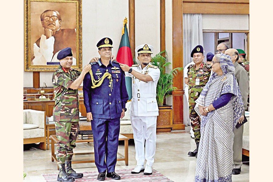 Newly-appointed Chief of Air Staff of Bangladesh Air Force Hasan Mahmood Khan adorned with the rank badge of Air Marshall by Chief of Army Staff General SM Shafiuddin Ahmed and Chief of Naval Staff Admiral M Nazmul Hassan in presence of Prime Minister Sheikh Hasina at Ganobhaban in the city on Tuesday — PID