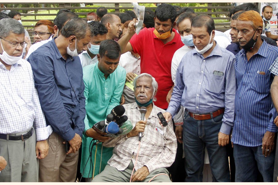 Gonoshasthaya Kendra founder Dr Zafrullah Chowdhury addressing a rally in front of the National Press Club in the city on Monday demanding release of Daily Sangram chief reporter Ruhul Amin Gazi, also the president of a faction of Bangladesh Federal Union of Journalists. Bangladesh Mufassil Sangbadik Association arranged the event — Focus Bangla
