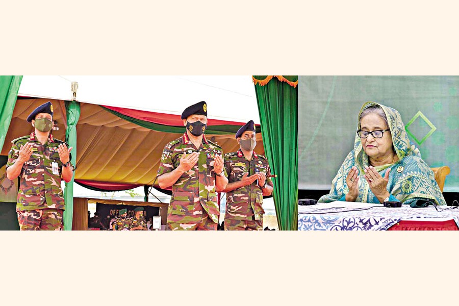 Prime Minister Sheikh Hasina offering Munajat after inaugurating the Sheikh Russell Cantonment at Jazeera in Shariatpur virtually on Tuesday — PID
