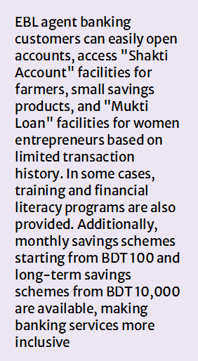 He said through EBL agent banking, customers can easily open accounts, access "Shakti Account" facilities for farmers, small savings products, and "Mukti Loan" facilities for women entrepreneurs based on limited transaction history. In some cases, training and financial literacy programs are also provided. Additionally, monthly savings schemes starting from BDT 100 and long-term savings schemes from BDT 10,000 are available, making banking services more inclusive.