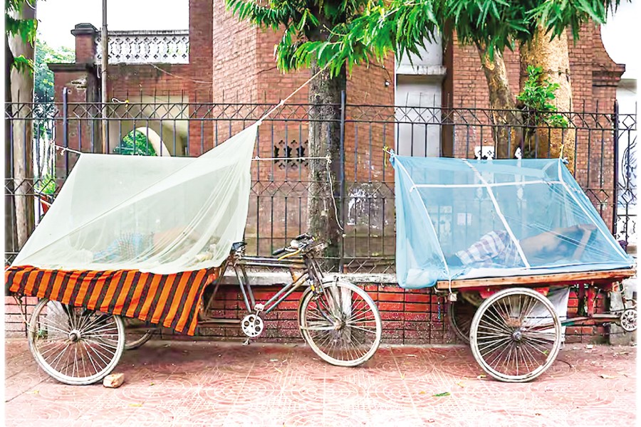 People sleep on three-wheeler carts using mosquito nets, following a surge in the number of dengue-infected patients, in Dhaka, on June 25, 2025. — Reuters file photo