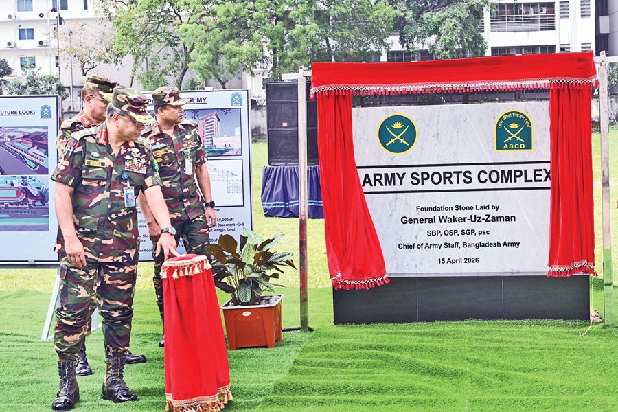 Chief of Army Staff General Waker-Uz-Zaman lays the foundation stone of Army Sports Complex in the area adjacent to Bangladesh Army Stadium in Dhaka on Wednesday. The sports complex -- aimed to be built as a modern and integrated sports infrastructure under the initiative of the army -- will have two indoor stadiums, a sports academy, gymnasium and modern sports science facilities. The sports complex will have special sections related to physiology, biomechanics, nutrition and sport medicine. Sportspersons of different levels will have the opportunity to gain modern training and research-based facilities.