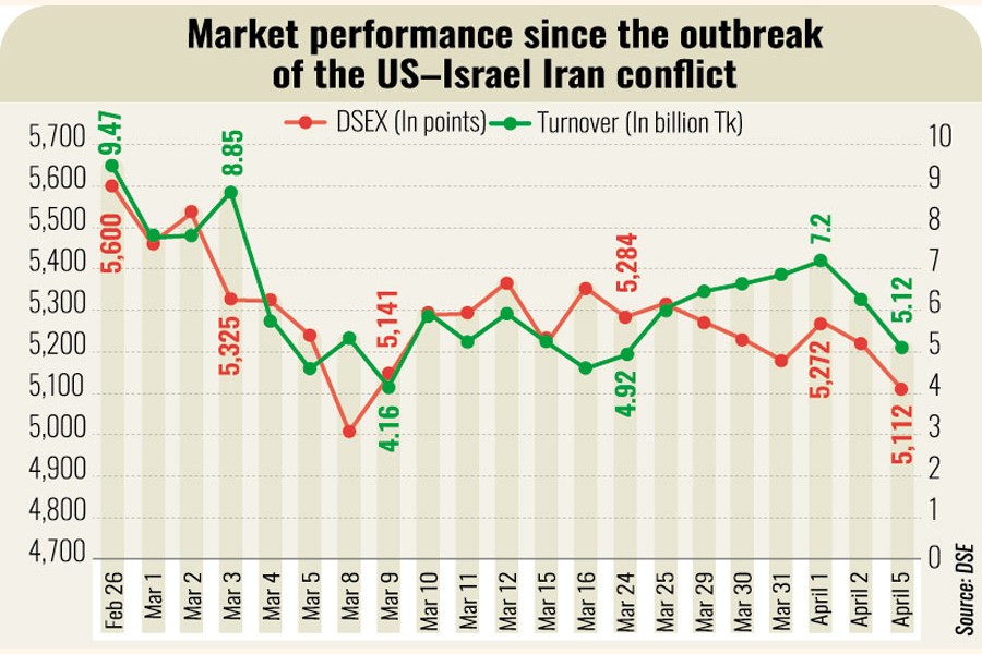 Md Sajedul Islam, a director of the DSE, said risk-averse investors largely stayed on the sidelines, closely observing market trends in the absence of any clear progress toward a ceasefire.