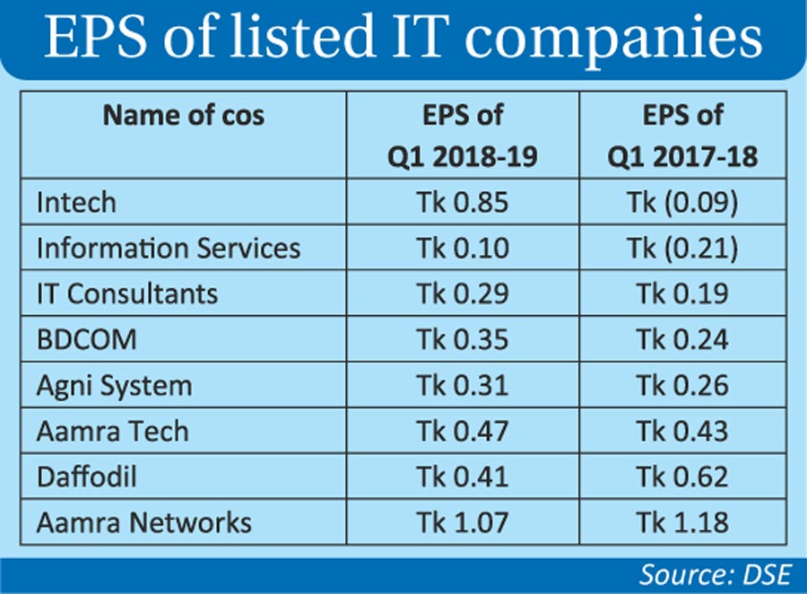 According to un-audited financial statements for the July-September quarter, FY 2018-19, the EPS of IT Consultants, BDCOM Online, Agni Systems, Aamra Technologies rose up to 53 per cent, compared to the same period of last fiscal year.