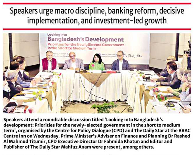 They made the observations at a roundtable, titled "Looking into Bangladesh's Development: Priorities for the Newly Elected Government in the Short to Medium Term", organised jointly by the Centre for Policy Dialogue and The Daily Star at the BRAC Centre Inn in the city.