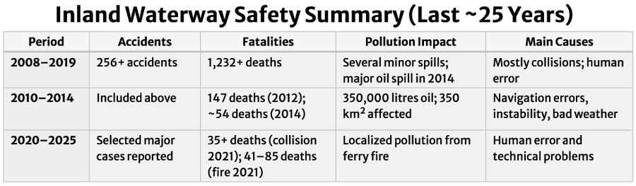 The urgency of reform becomes clearer when examining the accident record. Between 2008 and 2019, more than 256 inland waterway accidents were officially recorded. During this period, over 1,232 people lost their lives, at least 129 were injured and 359 were reported missing. Collisions remain the most frequent type of incident, particularly during the monsoon season when rivers become swollen, congested and unpredictable.