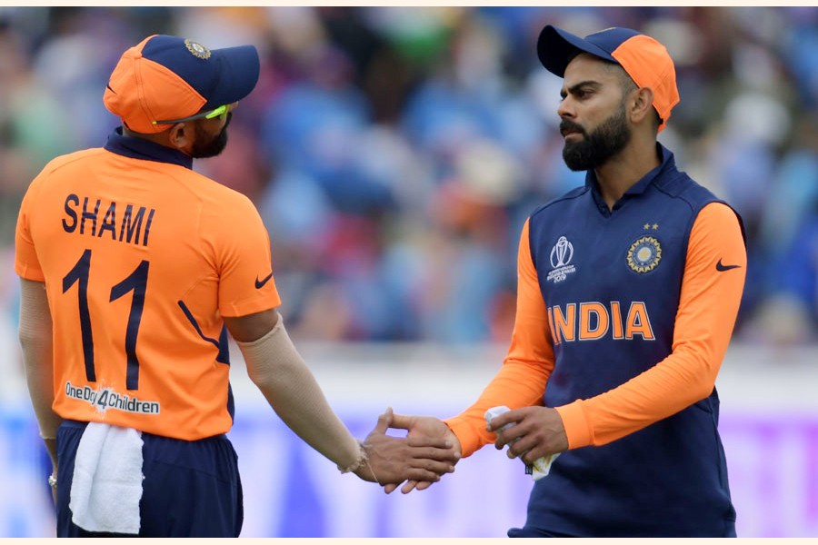 India's Captain Virat Kohli (R) congratulating teammate Mohammed Shami after his five-wicket haul at the end of the England innings during the 2019 Cricket World Cup group stage match between England and India at Edgbaston in Birmingham on Sunday — AFP
