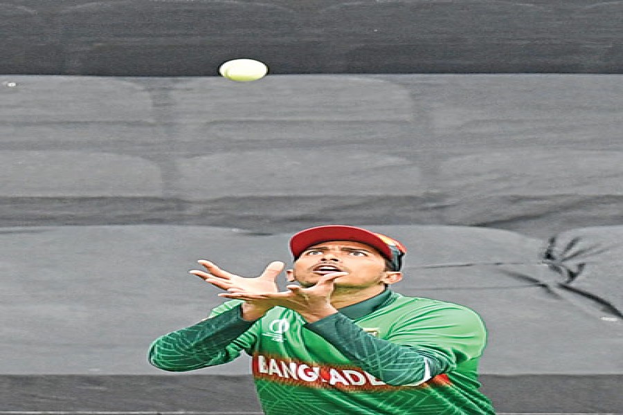 Soumya Sarkar taking the catch to take the wicket of West Indies' Nicholas Pooran during the 2019 Cricket World Cup group stage match between West Indies and Bangladesh at The County Ground in Taunton, southwest England on Monday — AFP