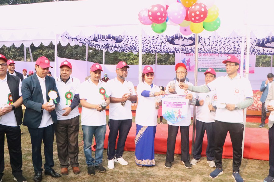 Professor Dr. Moahmmad Ali, chairman of RAKUB board of directors, inaugurates the Annual Sports Competition-2026 of Rajshahi Krishi Unnayan Bank (RAKUB) as the chief guest at Physical Education Playground in Rajshahi on Saturday. — FE photo