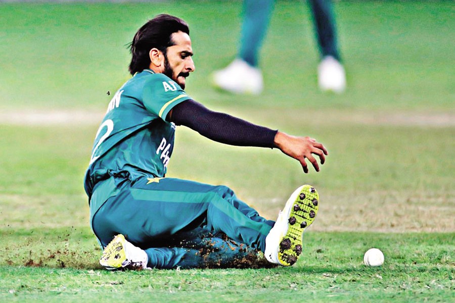 Pakistan's Hasan Ali reacts during the ICC men's Twenty20 World Cup semi-final match between Australia and Pakistan at the Dubai International Cricket Stadium in Dubai on Thursday — Reuters