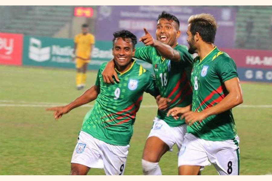 Players of Bangladesh football team celebrating after win over Sri Lanka in the Bangabandhu Gold Cup at Bangabandhu National Stadium in the city on Sunday — bdnews24.com