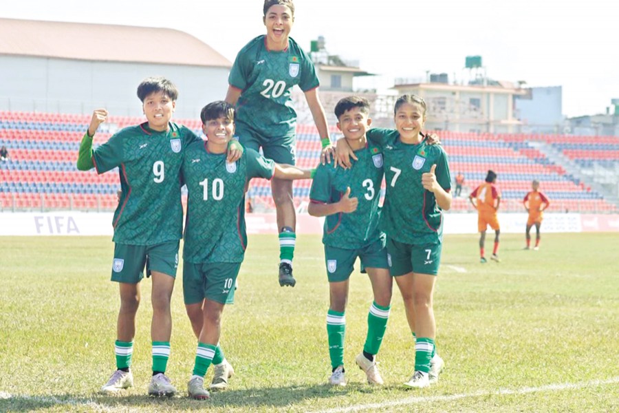 Players of Bangladesh under-19 women's national football team celebrate after winning against India in their second match of SAFF U-19 Women's Championship at Pokhara Rangasala Stadium, Nepal on Monday — BFF