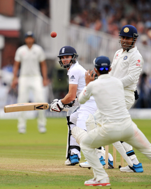 LONDON: England\'s James Anderson (left) watching as a shot he played is caught by India\'s Shikhar Dhawan (centre), dismissing him for 19 runs as India captain and wicketkeeper Mahendra Singh Dhoni (right) looking on. — AFP Photo