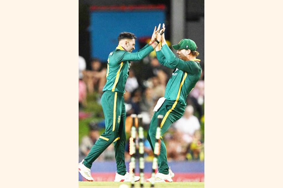 South Africa's Keshav Maharaj (L) celebrates with a teammate after taking the wicket of Australia's Josh Inglis during the first ODI match at Cazaly's Stadium in Cairns on Tuesday-AFP