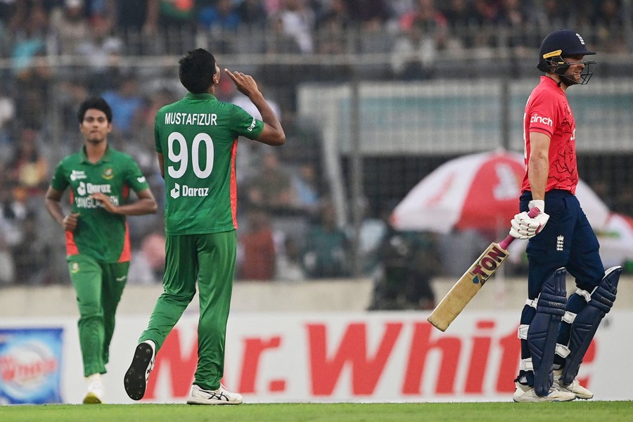Bangladesh's Mustafizur Rahman celebrating after taking the wicket of England's Dawid Malan (R) during the third and final T20 international match at the Sher-e-Bangla National Cricket Stadium in Dhaka on Tuesday — AFP