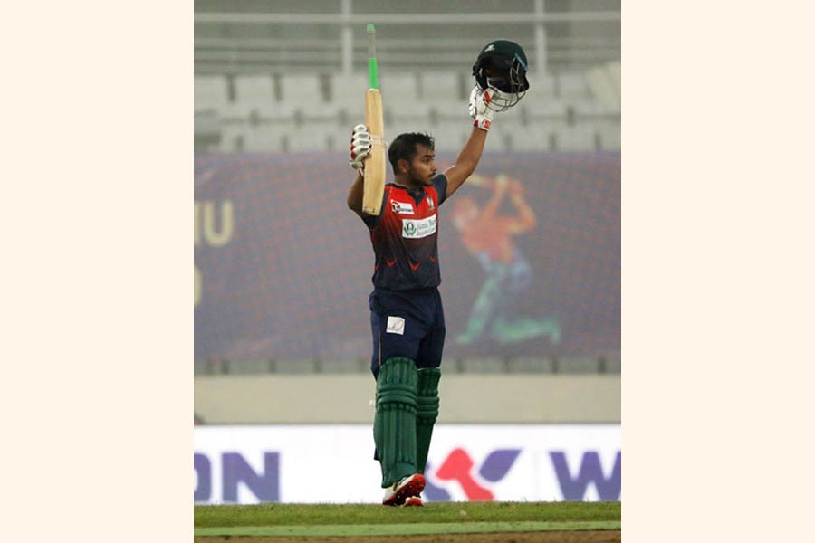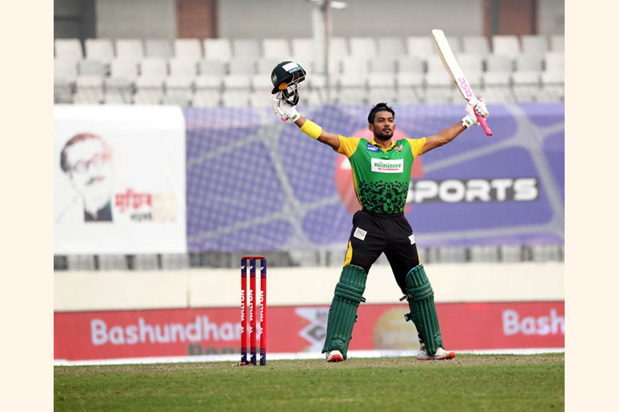 Captain of Minister Rajshahi Nazmul Hossain Shanto rejoicing after his century against Fortune Barishal on Tuesday — BCB