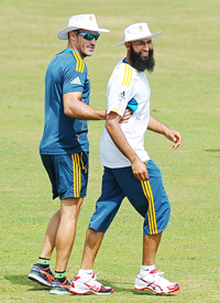 GALLE, Sri Lanka: South African cricket team captain Hashim Amla (R) shares a light moment with teammate Faf du Plessis (L) during a practice session at the Galle International Cricket Stadium here Tuesday. Amla will make history Wednesday when he takes t