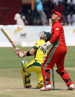 HARARE: Australia\'s batsman Brad Haddin (L) and Zimbabwe\'s wicketkeeper Brendan Taylor eye the ball during the One Day International triangular series cricket match between Australia and Zimbabwe at the Harare Sports Club Sunday. — AFP Photo