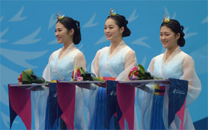 INCHEON: Hostesses attend the medal ceremony of the women\'s 53kg weightlifting event during the 2014 Asian Games here Sunday. — AFP Photo