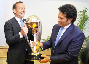 MUMBAI: Australian Prime Minister Tony Abbott (L) and former Indian cricketer Sachin Tendulkar pose with the Cricket World Cup trophy at an event here Thursday. — AFP Photo