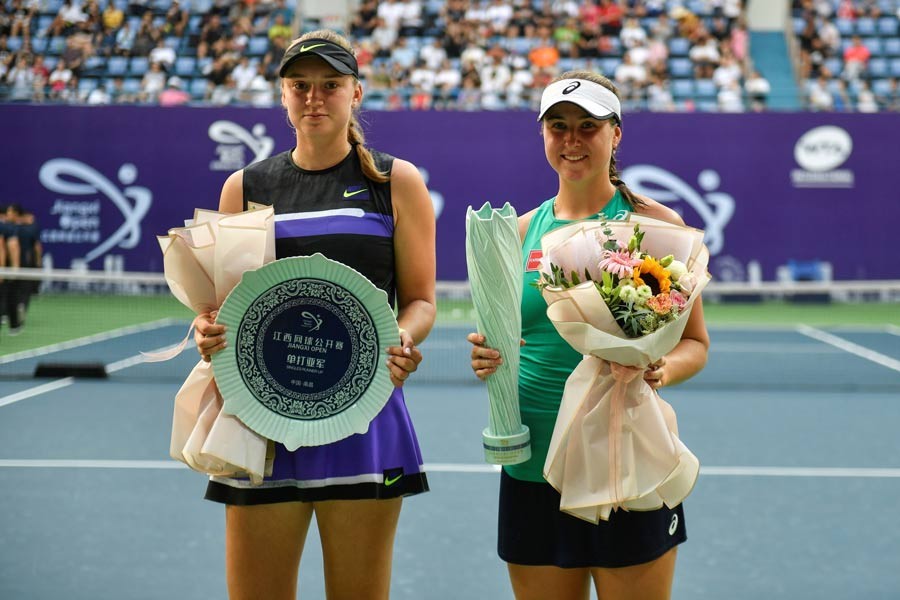 Rebecca Peterson (R) of Sweden posing for photograph after winning the women's singles final match against Elena Rybakina (L) of Kazakhstan at the Jiangxi Open Tennis Tournament in Nanchang in China on Sunday — AFP