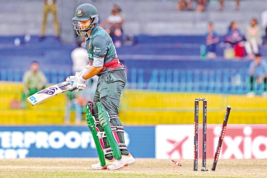 Skipper Shakib Al Hasan is clean bowled by India's Shardul Thakur during the Asia Cup 2023 Super Four one-day international (ODI) cricket match between India and Bangladesh at the R. Premadasa Stadium in Colombo on Friday — AFP
