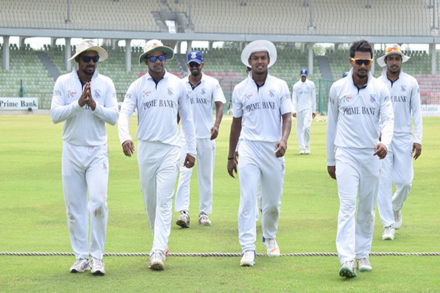 Cricketers of Prime Bank South Zone leaving the field after closing the third day of the four-day 4th round match against Islami Bank East Zone in the 6th Bangladesh Cricket League at the Sylhet International Cricket Stadium on Thursday — bdnews24.com